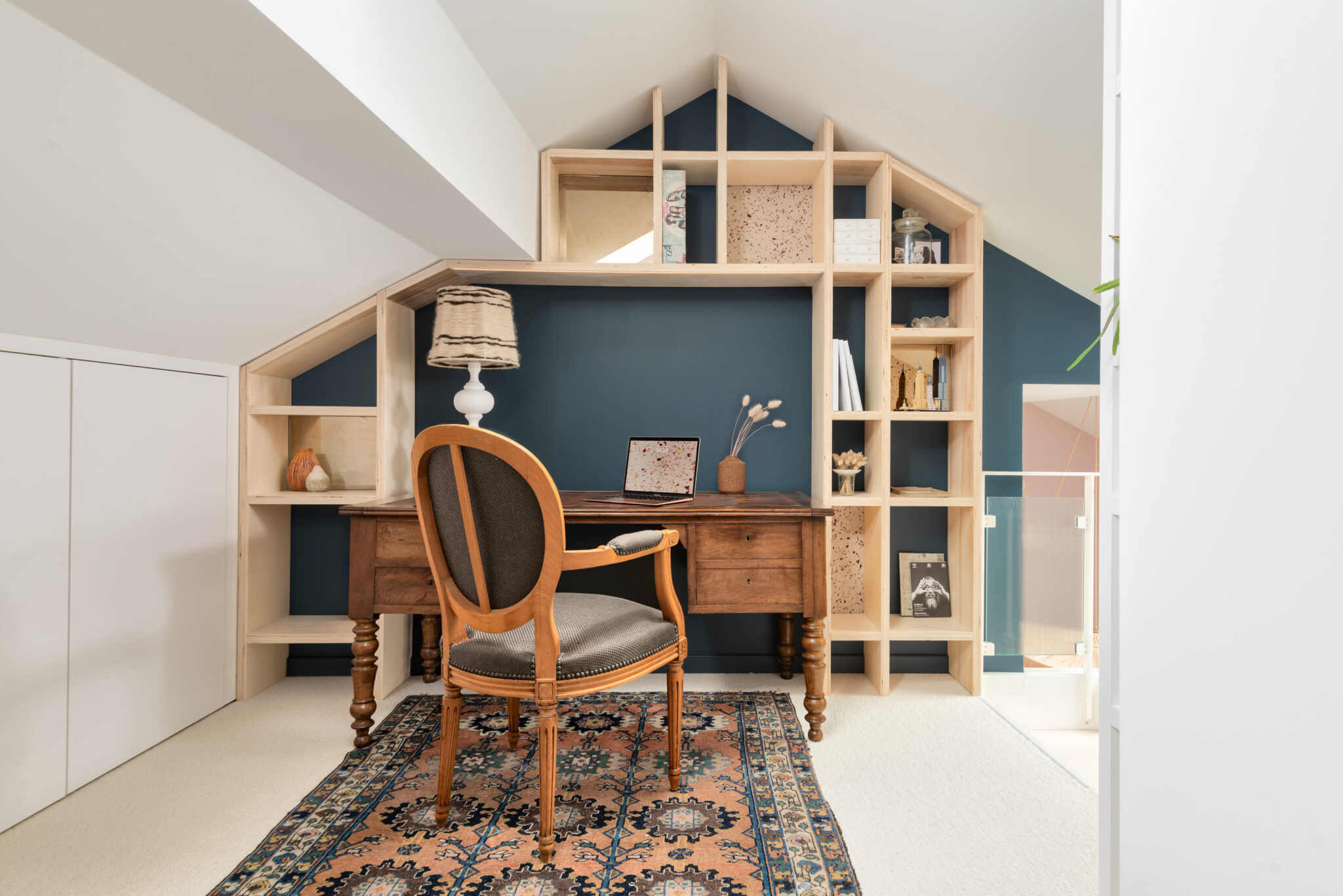 Créer un espace bureau sous pente, fonctionnel et confortable et concevoir un escalier original, entièrement sur mesure.
