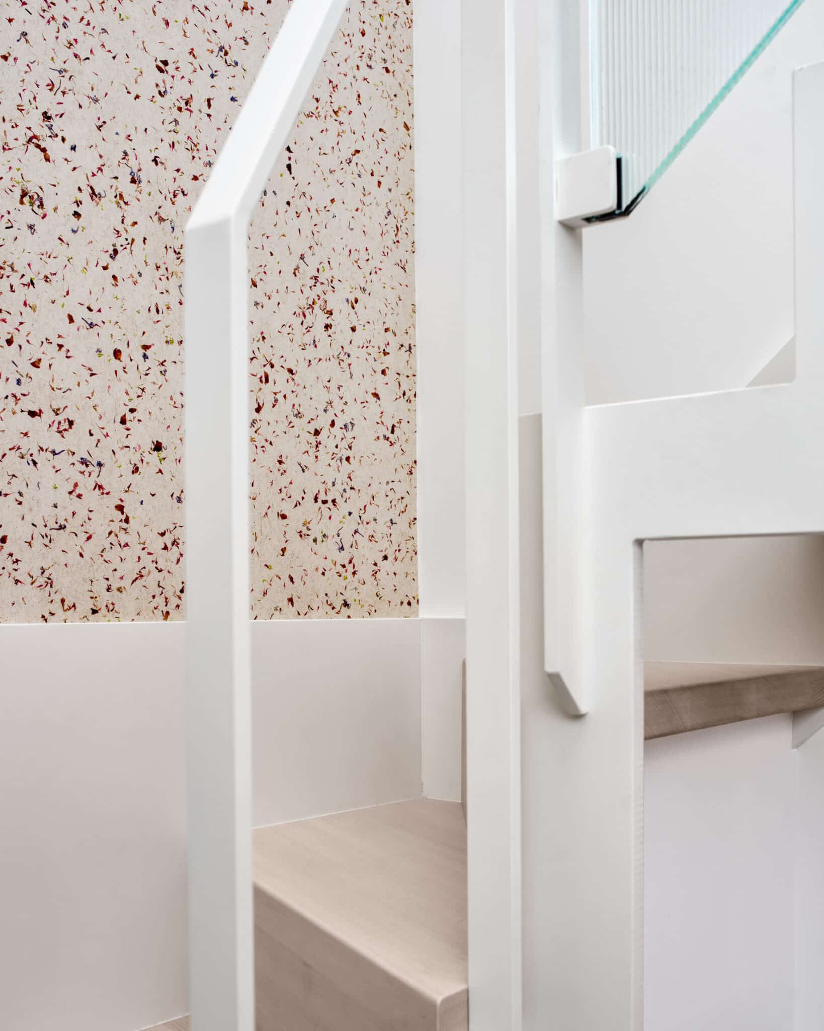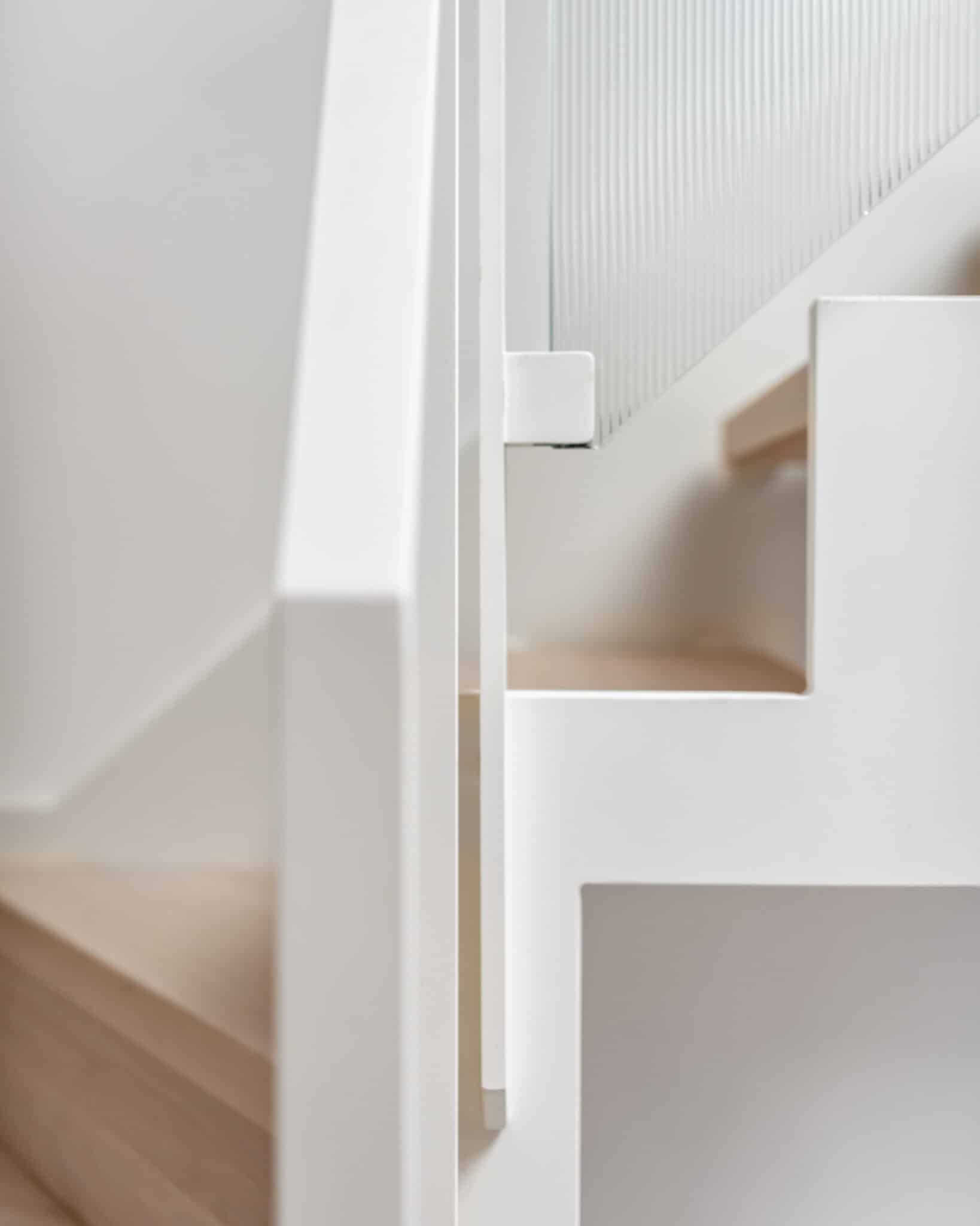 L’ancienne échelle a été supprimée afin de laisser place à un escalier sur mesure en bois et métal thermolaqué blanc, composé de deux parties :